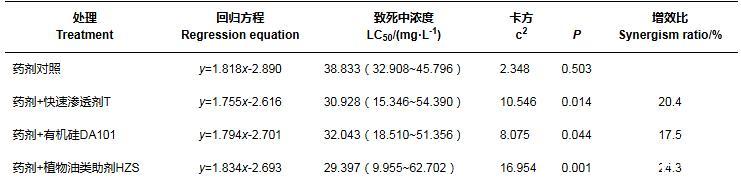 表3 3种助剂添加后螺虫乙酯防治石斛菲盾蚧室内毒力变化