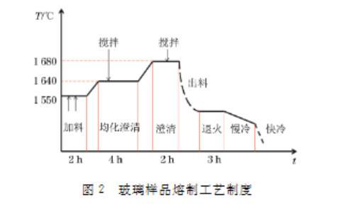 实验样品的熔制流程如图2所示,首先根据组分设计计算玻璃配方,称量并配制约500g配合料,在研钵内充分研磨、混合均匀,待硅钼棒电炉升温至1550 ℃时,将混合均匀的配合料分多次加入预热过的铂金坩埚中,保温2h至原料熔化充分后以5 ℃/min的升温速率加热至1640 ℃,并在该温度条件下保温4h,实现玻璃的充分熔化与澄清。然后继续升温至1680 ℃保温2h使玻璃液完全澄清,出料前30 min进行搅拌,然后将玻璃液浇筑在预热的耐热钢模内,成型后转入780 ℃的马弗炉内进行退火处理,保温3h后再以1 ℃/min降温速率慢冷至300 ℃,随炉冷却得到经过退火的玻璃样块。
