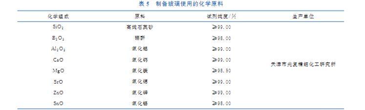 实验所用的玻璃原料包括石英砂、氧化铝、硼酐(氧化硼)、氧化钙、氧化镁、氧化锶、氧化锌,化学澄清剂所用原料为氧化亚锡,试剂纯度等级均为分析纯(AR),实验设计引入成分及使用的原料种类、具体纯度如表5所示,所有化学成分均以氧化物原料的形式引入,玻璃成分中除原料可能含有的部分杂质以外,均不含任何人为引入的其他成分。