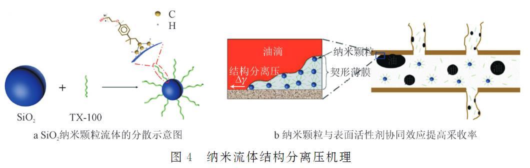 WasanD等提出的“结构分离压”理论,解释了纳米流体在油-固界面时这种压力作用将油膜或油滴从岩石表面分离的过程。通过进一步的研究发现,这种结构分离压力的大小和速度受到纳米颗粒浓度和液滴体积的影响。ZHAO等以非离子表面活性剂(TX-100)作为分散剂和增效剂,将SiO2纳米颗粒分散在水中形成SiO2纳米流体(如图4a所示),并对SiO2纳米流体剥离固体表面油滴的能力进行了探究。SiO2纳米流体和表面活性剂(TX-100)均具有将油滴从岩石表面脱离的能力。与表面活性剂(TX-100)相比,当添加SiO2纳米颗粒时,纳米流体可以在油/固体/纳米流体三相接触区形成薄膜从而产生结构分离压,将油滴从岩石表面剥离。由于表面活性剂天然剥离油滴的能力和SiO2纳米颗粒的结构分离压力机理(如图4b所示),SiO2纳米流体具有优秀的渗吸提高采收率能力。