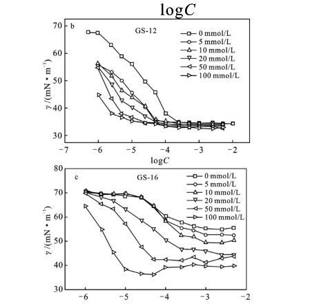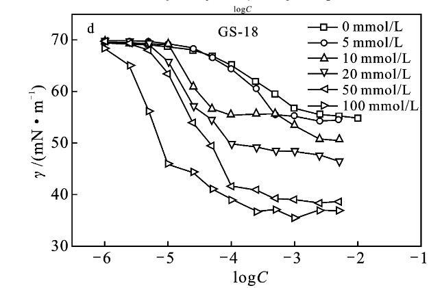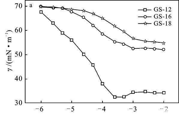 图5表面活性剂GS-12,GS-16,GS-18溶液的表面张力随浓度变化曲线(a)和Gemini表面活性剂的表面张力随KBr盐浓度的变化曲线(b~d)