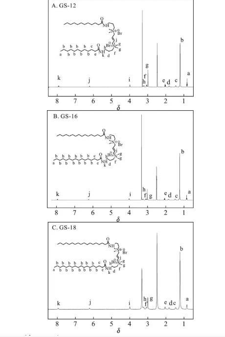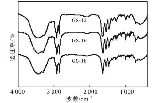根据方案1的合成路线,成功制备了3种以1,4-二溴-2-丁烯为连接基团的酰胺基Gemini表面活性剂。利用红外和核磁对酰胺基Gemini表面活性剂GS-12,GS-16,GS-18进行结构表征,结果见图1和图2。