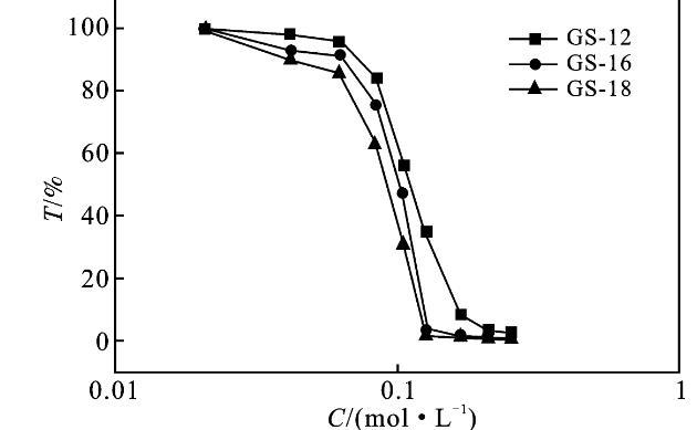 2.2.2耐盐性能随着盐浓度的增加,浊度的突然增加是表面活性剂溶液中宏观相分离的标志,这就是盐析现象[7,11]。图4为KBr/GS表面活性剂溶液,随着KBr含量的增加,在波长为500 nm的吸光度变化曲线。以GS-12为例,当KBr浓度为0~60 mmol/L时,1 mmol/L的Gemini表面活性剂水溶液为无色透明,浊度同时略有下降,说明有混合胶束形成。当KBr的浓度从60 mmol/L增加到120 mmol/L时,溶液呈现微浑浊,说明体系中有少量的表面活性剂颗粒析出。而GS-16,GS-18在更低的浓度下就发生了盐析现象。也就是说,盐的析出现象是非常复杂的,这不仅取决于盐的性质,而且取决于双子表面活性剂的结构[12-13]。此外,由图4透过率的变化可知,随着疏水链的增长,表面活性剂的耐盐性能减弱,更容易受盐浓度的影响。因为无机盐消除离子头基团的电荷,减少吸附膜内头基基团与胶束之间的静电排斥。它们通过减少头基之间的静电相互作用和最小化有效截面积来促进胶束的产生和聚集,导致表面活性剂从溶液中聚沉而析出[13]。
