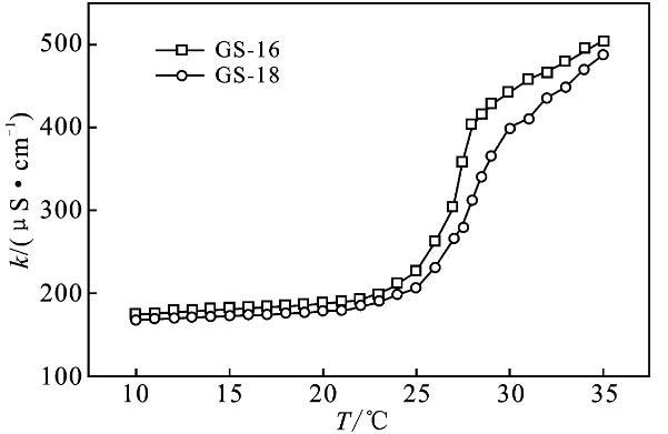 2.2.1 Krafft温度Krafft温度影响表面活性剂溶解度,表面活性剂在此温度以上可以形成胶束。在Krafft温度以下,以单分散的表面活性剂与水化固体表面活性剂的状态存在,而在Krafft温度以上,水化固体表面活性剂的溶解和胶束形成也参与了平衡[9-10]。质量分数1%表面活性剂GS-12,在室温可以完全溶解,将其溶液置于冰水混合物中1周,溶液仍然澄清透明,没有浑浊的迹象。表明GS-12的Krafft温度低于0℃。通过测量电导率可以得到Krafft温度的近似值,由图3可知,GS-16,GS-18的Krafft温度分别为27,27.5℃。k值在较低温度下缓慢增加,这是由于离子表面活性剂的溶解度有限。随着温度的进一步升高,Krafft温度处的k值急剧增加。k值的增加是由于胶束的形成,水合表面活性剂的溶解度突然增加,直至达到克拉夫特温度。此外,离子迁移率增加随着温度增加、k逐渐增加[3,10]。结果表明,Gemini表面活性剂的Krafft温度随表面活性剂的疏水链长的增加而升高。