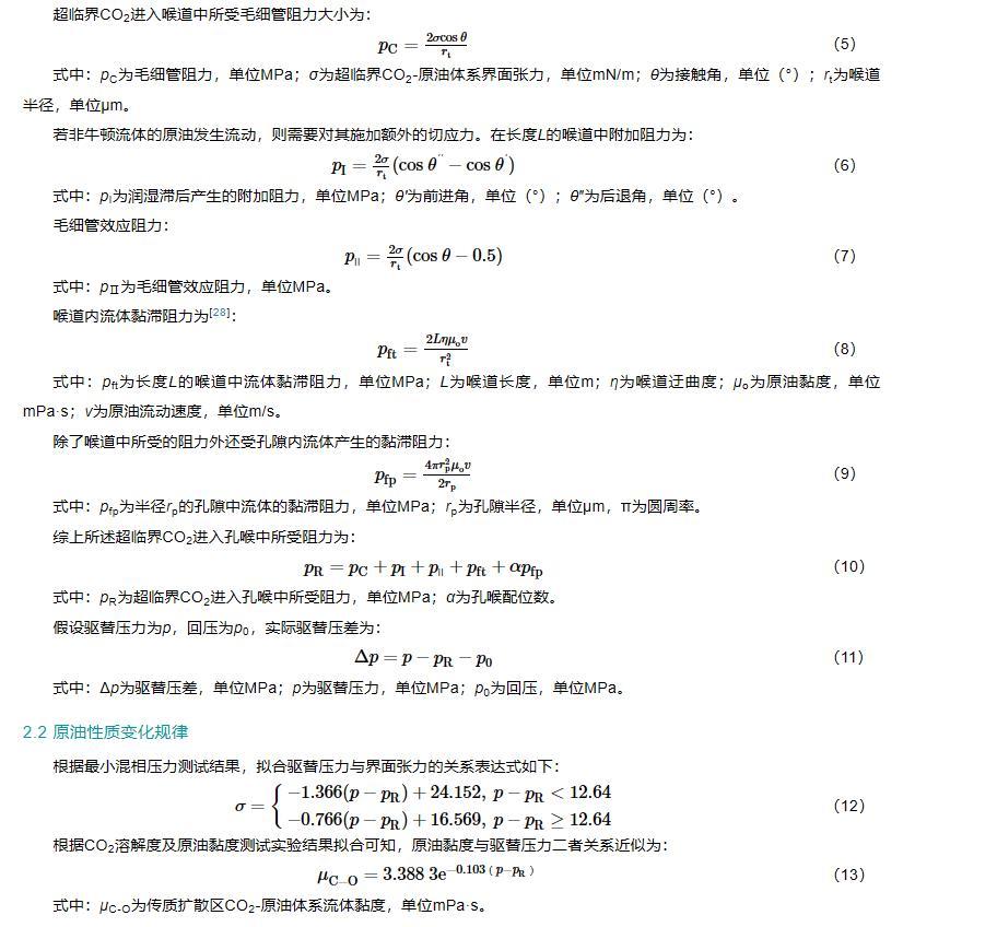 CO2进入孔喉时与原油的接触时间较短,来不及进行扩散、溶解,此时原油和CO2的物理性质尚未发生变化。超临界CO2进入喉道中所受毛细管阻力是由超临界CO2-原油界面张力、润湿接触角、孔喉半径等参数共同引起: