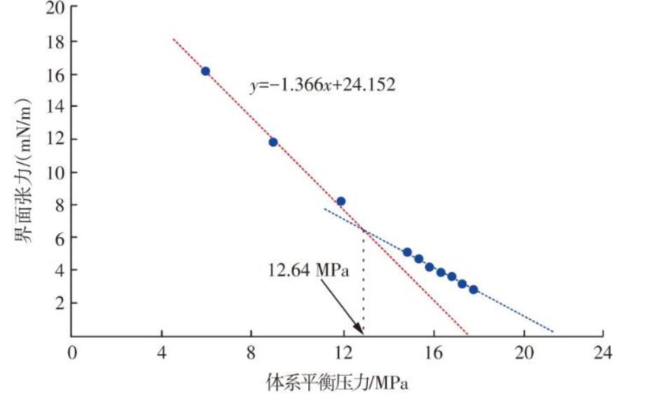 如图2所示,悬滴法测试结果表明:当体系平衡压力<12.64 MPa时,界面张力随体系平衡压力的增大而快速减小,其线性拟合的直线与X轴交点位于17.56 MPa,该体系平衡压力为多级接触最小混相压力;当体系平衡压力≥12.64 MPa时,界面张力减小幅度变缓,线性拟合的直线与X轴交点位于21.63 MPa,代表了CO2与原油一次接触最小混相压力。