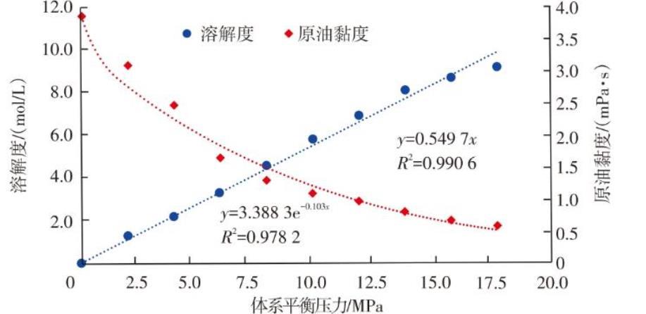 实验测定60℃和不同压力条件下CO2溶解度及原油黏度的变化特征。如图1所示,CO2溶解度与体系平衡压力呈近似线性关系,原油黏度与体系平衡压力呈近似指数关系。初始状态下,原油黏度为3.98 mPa·s,但当体系平衡压力上升到18 MPa时,原油黏度降低至0.59 mPa·s。
