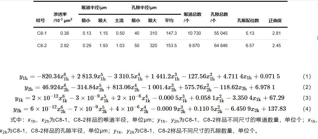 式中:x1h、x2h为C8-1、C8-2样品的喉道半径,单位μm;y1h、y2h为C8-1、C8-2样品不同尺寸的喉道数量,单位个;x1k、x2k为C8-1、C8-2样品的孔隙半径,单位μm;y1k、y2k为C8-1、C8-2样品不同尺寸的孔隙数量,单位个。