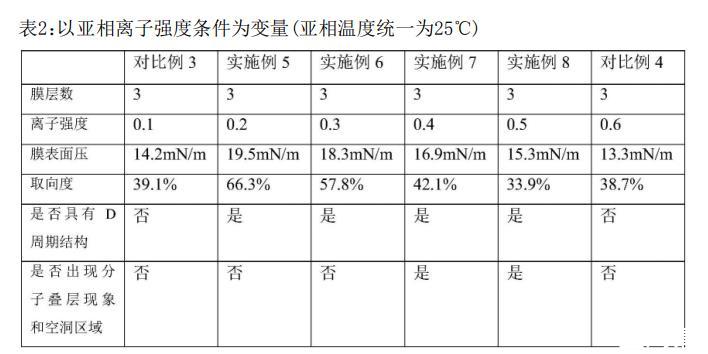 •对比实验:亚相温度过高(>30°C)或离子强度过低(<0.2)会导致纤维排列混乱(对比例1–4),超纯水亚相则无法形成D周期结构(对比例5)。