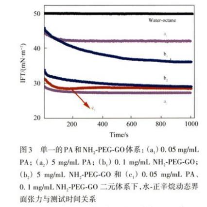 在25℃条件下,测得水和正辛烷之间的界面张力为50.7 mN/m(图3),与之前研究中报道的界面张力值51.16 mN/m非常接近。为了研究PA与NH2-PEG-GO在共存时对界面张力的影响,分析了0.05 mg/mL PA、0.1 mg/mL NH2-PEG-GO各自对界面张力的影响。图3显示PA与NH2-PEG-GO均具有界面活性,能够吸附到水-正辛烷界面上,降低界面张力。同时也观察到:0.05 mg/mL PA降低界面张力速率快,平衡时间较短(<200 s),界面张力曲线呈现先快速下降后平衡的趋势,而当0.1 mg/mL NH2-PEG-GO存在于溶液中时,界面张力降低速率较慢,大约在700 s后达到平衡。分析发现,界面张力随着时间的演变呈现先快速下降,后缓慢下降,最后平衡的特点,这表明接近吸附平衡时出现势垒,减缓了粒子在界面上的进一步吸附。这种吸附势垒由多种因素导致,通常与已吸附在界面上的分子所产生的表面压以及随着界面密度提高,分子取向的改变相关。同时在吸附后期,可供吸附的界面面积减少,已经吸附到界面上的粒子必须重新排列以空出足够的空间供额外的粒子进行吸附。这种重排的速率是由粒子的面内迁移率决定的,即粒子在界面上的扩散系数。该扩散系数通常要小于粒子在本体中的扩散系数,并与粒子尺寸、粒子表面配体修饰等相关。