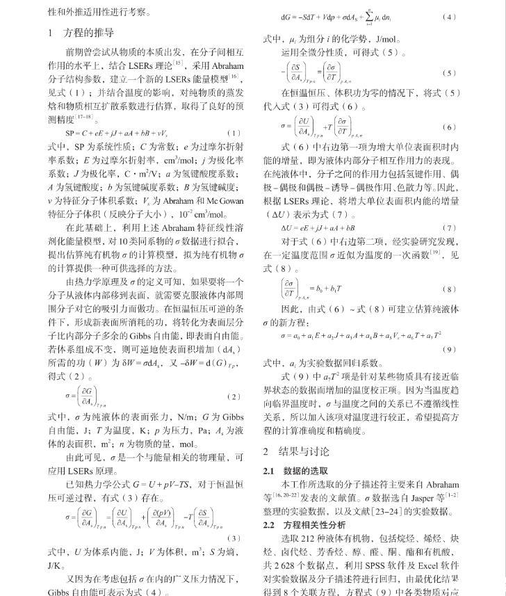 本工作提出一种将σ这一宏观物性与微观分子间作用力相关联的一种新的计算方法。根据线性溶剂化能量关系(LSERs)理论和经验方程,提出了在不同温度下估算纯有机物σ的关联式。利用所得关联式对2 628个纯组分体系中的10个同系物进行了回归,得到了σ的关联方程,并对方程的相关性和外推适用性进行考察。