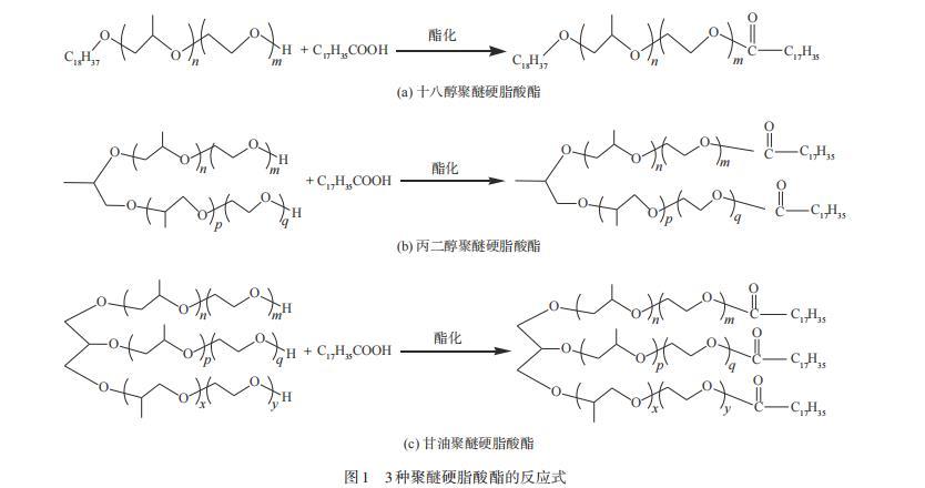称取一定质量的聚醚包括不同脂肪醇聚醚、丙二醇聚醚和甘油聚醚,同不同脂肪酸置于500 mL的反应烧瓶内,搅拌,升温,当温度上升至80℃时,加入0.2%(相对于体系总质量)的对甲苯磺酸作为催化剂,改变体系状态为真空,压力在−0.095 MPa以下。继续升温至140℃,保温4 h,然后降温至60℃,加入NaHCO₃中和催化剂,继续搅拌降温至室温,得到聚醚脂肪酸酯(以下简称聚醚酯)消泡剂。以硬脂酸为例合成的不同聚醚酯如图1所示。