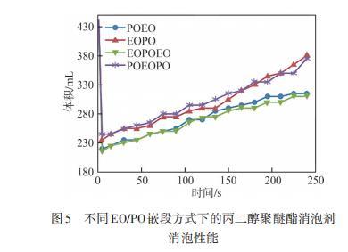图5不同EO/PO嵌段方式下的丙二醇聚醚酯消泡剂消泡性能