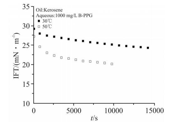 在油田开采过程中,油藏温度是必须考虑的要素之一。对于分子结构中含聚氧乙烯基团(EO)的表面活性剂,温度升高会破坏EO与水分子形成的氢键,增大表面活性剂的油溶性,对界面张力的影响较大。而对于离子型表面活性剂,温度对界面张力的影响较小。Fig.8示出了1000mg/L B-PPG溶液在30℃和50℃时的动态界面张力。由图可见,在50℃时,体系的界面张力比30℃时降低了5mN/m左右。B-PPG的水溶性很大程度来源于酰胺基团与水分子形成的氢键,因此,温度升高,B-PPG的油溶性增大,界面吸附量有所增加,界面张力明显降低。
