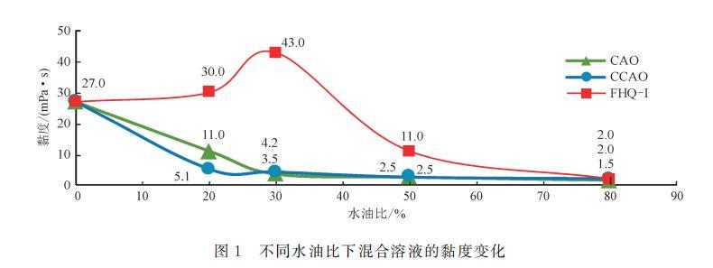 将CAO、CCAO和FHQ-I分别与现场采集的黏度约为27mPa·s的原油进行混合,配置成200ml混合溶液,用六速旋转黏度计在200r/min的条件下,对水油比分别为20%、30%、50%和80%的混合溶液的黏度进行测量,结果如表3和图1所示。