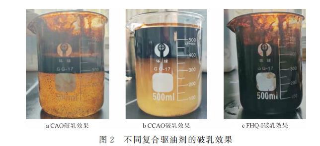 取一定量的CAO、CCAO或FHQ-I以及约35%的原油分别和65%的模拟地层水置于500ml烧杯中,将烧杯放入30℃六速搅拌器中,以200r/min的速度恒温搅拌20min,使其完全乳化,破乳效果如图2所示。