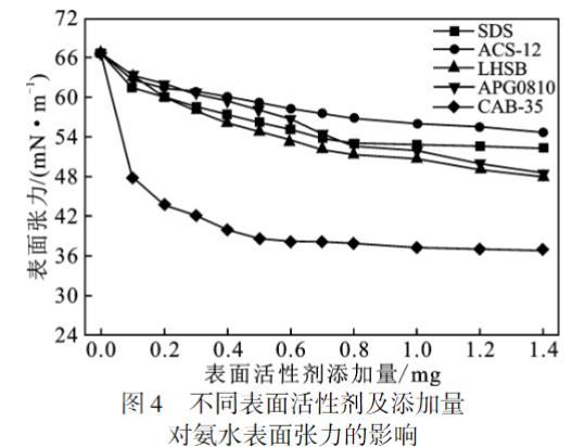 (3)不同含量的SDS、ACS-12、LHSB、APG0810和CAB-35表面活性剂均能使氨水溶液的表面张力显著下降,其中,同含量下含有CAB-35的氨水溶液表面张力值降幅最大。
